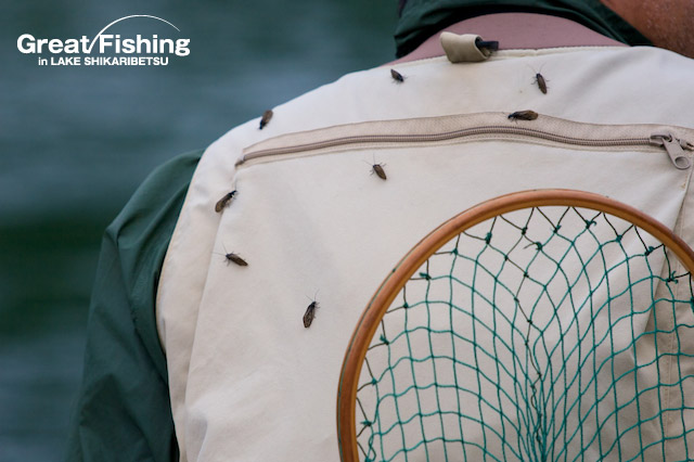 今年は水生昆虫「センブリ」が例年より数多くハッチしていますが、ハッチに伴うライズは場所と時間によりまったく違います。最近は比較的に早朝(6時〜8時)頃にかけ上がりでライズしており、午後になるにしたがいライズは少なくなるようです。また太陽の日差しが湖周辺を照らすと陸生昆虫が活発になるので、テレストリアル(昆虫パターン)のフライ、ルアーが有効。かけ上がり周辺でなかなかニジマスが釣れない時には、少し沖目の水深(5〜8m)を探るようにしてください。場所によってはミヤベイワナも混じります。