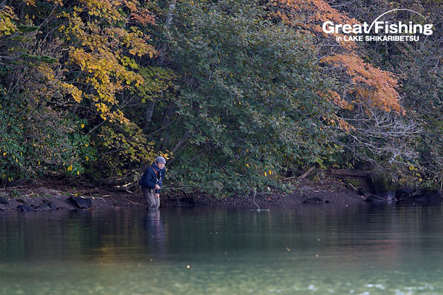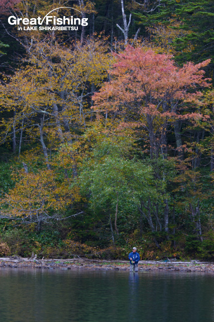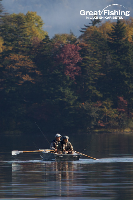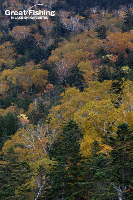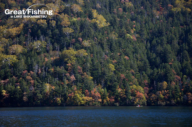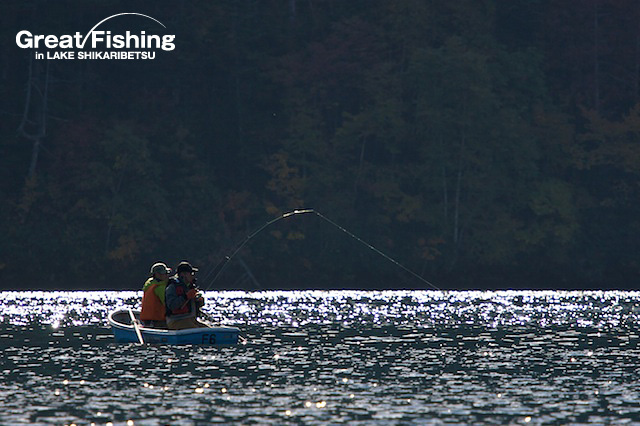 早朝から無風。青空が広がり、紅葉に彩られた然別湖… 湖面は鏡のようにベタ凪になり、これまで早朝から好調だったミヤベイワナが、弱い当たりとチェイスのみで釣果は低迷。午前10時頃からようやく少し風が吹き、湖面が揺れ始めてからは、徐々にヒットするようになりました。午後からは、イワナ岬沖[11]、湖中央[19][18]、虹色岬沖[3]など、ポイントによっては連続ヒットする場面もあったようですが、今日は全体的にミヤベイワナの活性は低いようでした。全体の釣果は一人(0〜5匹)今日最高の釣果は11匹(笹川さん/札幌市)