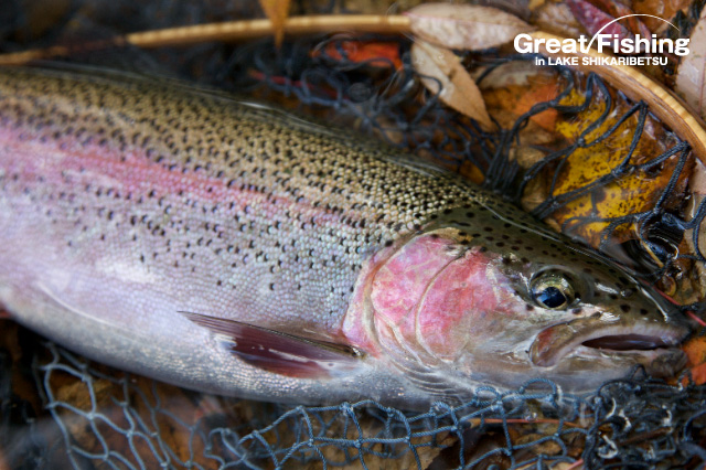 今日のビッグワン ニジマス47cm(1の湾)(霜田さん/横浜市)然別湖ガイドマップ