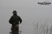 今日は曇り(濃霧)で気温が低く、昆虫はほとんど活動していない様子。そのためライズは少ないようでしたが、岸際へドライフライをキャストして、ニジマスの他、ミヤベイワナ(24〜37cm)、サクラマス(25〜30cm)がヒットしています。ベタ凪の表層でライズする魚たちは、とてもセレクティブ。クルージングして来た魚がフライをまったく見ない場合は、フライがまったく合っていないケースが多く、フライ手前でUターンする場合は、フライが僅かに違うケースが多いようです。セカンドステージで実績の高いドライフライは、#16〜14パラシュート(ダーク系)や、#16〜14CDCダン、#16〜14カディス(ダーク系)等。