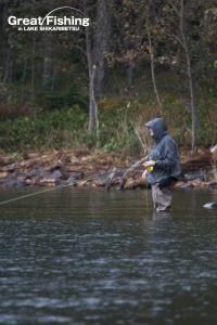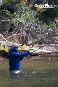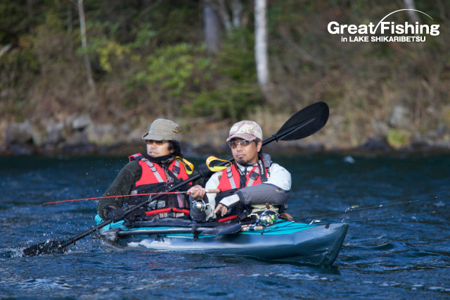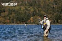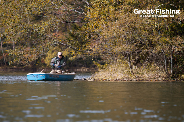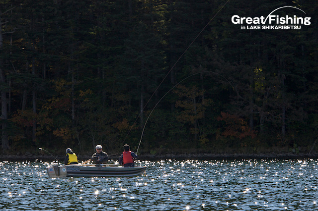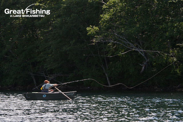 ミヤベイワナはあまり岸寄りしておらず、湾の中央や湖中央が狙い目。ルアー、フライを水深(5〜7m)まで一旦沈めて、スローでリトリーブしてみましょう。