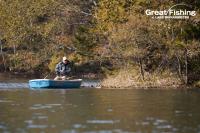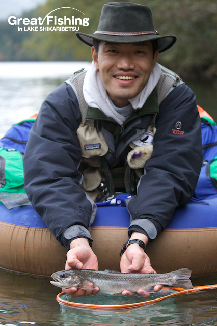 セカンドステージの魅力のひとつ「大型ニジマス」の最高は52.5cm(高橋正さん/新得町)。今日ヒットしたニジマスのサイズは45cmクラスがもっとも多いようでした。フライは、#6〜8ストリーマー(ダークカラー系)が良く、掛け上がり周辺の水深(3〜5m)で釣れています。また、ライズがあるポイントでは、#18〜#16のドライフライが良いようです。ルアーは、スプーン8〜10g(金/ピンク)など。