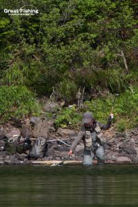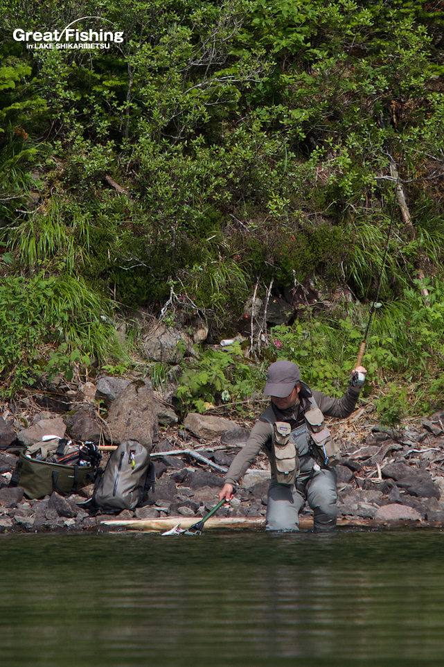 ミヤベイワナ(27〜30cm)のヒットは非常に少なく、最も釣れた人が3匹(梁田さん/札幌市)。例年、セカンドステージで数多く釣れる、産卵行動をしない未成熟なサクラマス(20〜25cm)もあまり釣れていないようです。