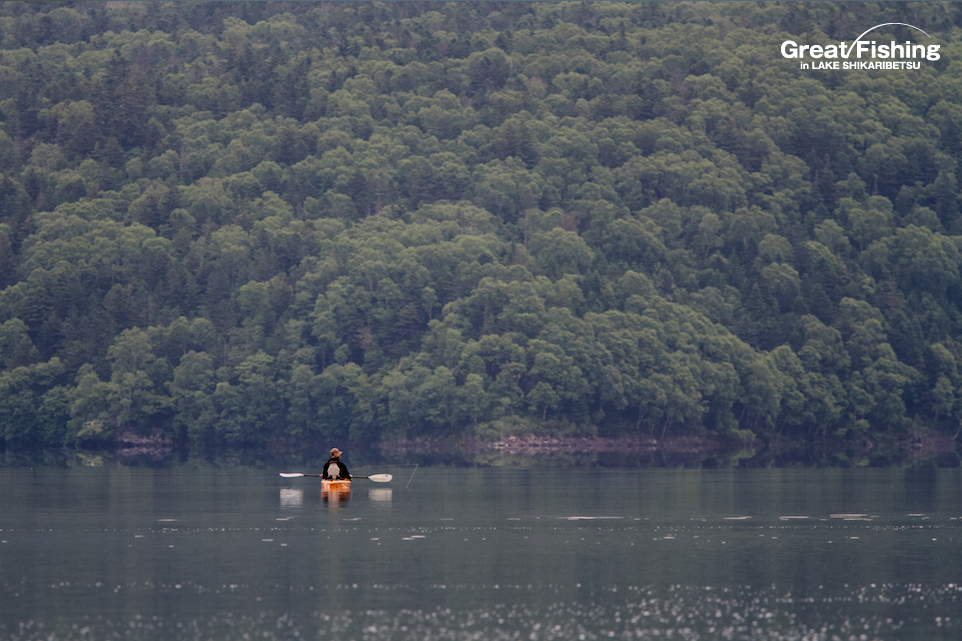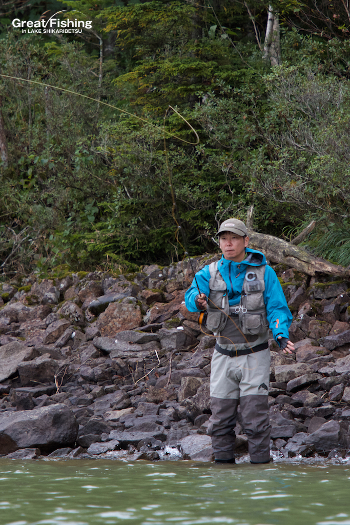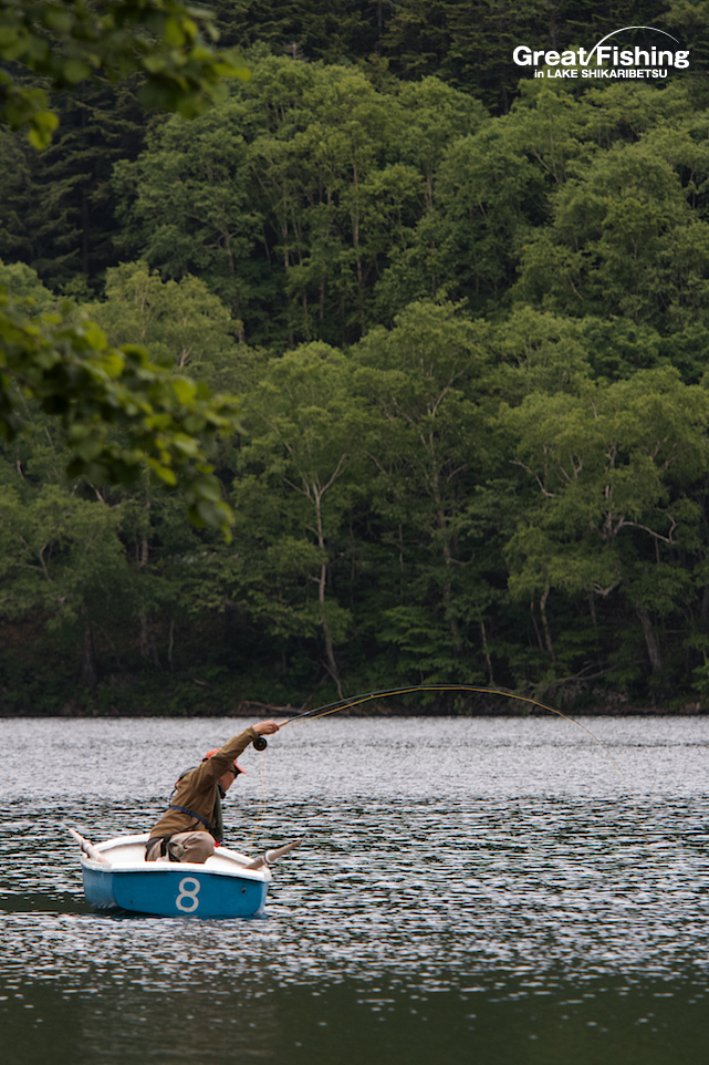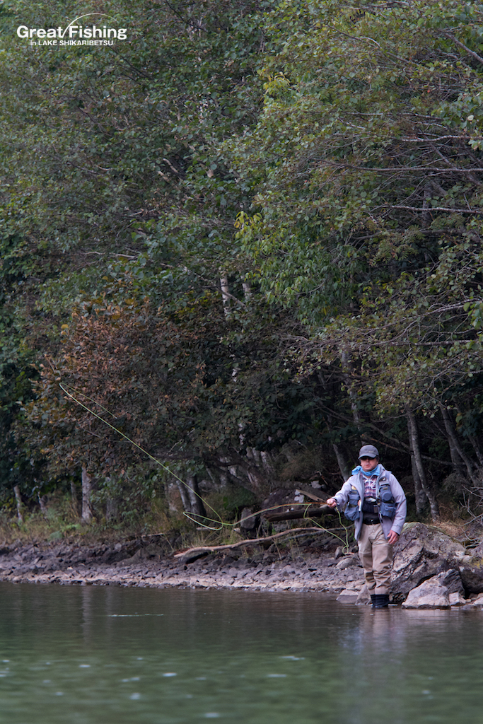 昨日と今日の早朝の気温は8℃。日中の最高気温も17℃と低く、昨日同様、陸生昆虫が非常に少なく、ニジマスのドライフライへの反応は渋いようでした。午後から1の湾(桟橋周辺)で単発のライズがあり、ニジマス(40〜45cm)2匹が、#12ビートルでヒット(高橋さん/幕別町)。(シンキングラインタイプ2)+(ストリーマー/アクアマリン)のハーリングでは、ニジマス(35〜40cm)4匹ヒット(金澤さん/中札内村)。ルースニングでは、思い出岬周辺ポイント⑮ で、ニジマス(52cm)がヒット(高橋さん/鹿追町)。(ビーズヘッドニンフ/黒)で、ニジマス(26〜32cm)2匹、サクラマス(30〜34cm)3匹ヒット(鳥原さん/旭川市)他。
