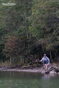 かけ上がり周辺(岸から1〜3m)で、ニジマス(15〜60cm)が、ルアー(スプーン・ミノー)、フライ(ドライ・ストリーマー)で釣れています。フライでは、音更湾岸釣りエリアポイント[9]では、スペイキャスティング+ストリーマー(マラブー/オリーブ)で、ニジマス(60cm)がヒット。フライラインはインターミディエイト(美山さん/札幌市)。唐沢湾岸釣りポイントでは、ストリーマー(#10ウーリーバガー/黒)で、ニジマス(43cm、45cm、55cm)がヒット(多田さん/置戸町)、ドライフライでは、1の湾ポイント[1]旧北電保養所前周辺で、ニジマス(41cm、48cm)が、#16アントパラシュート・#16ピーコックパラシュートでヒット(天野さん/福岡市)他多数。