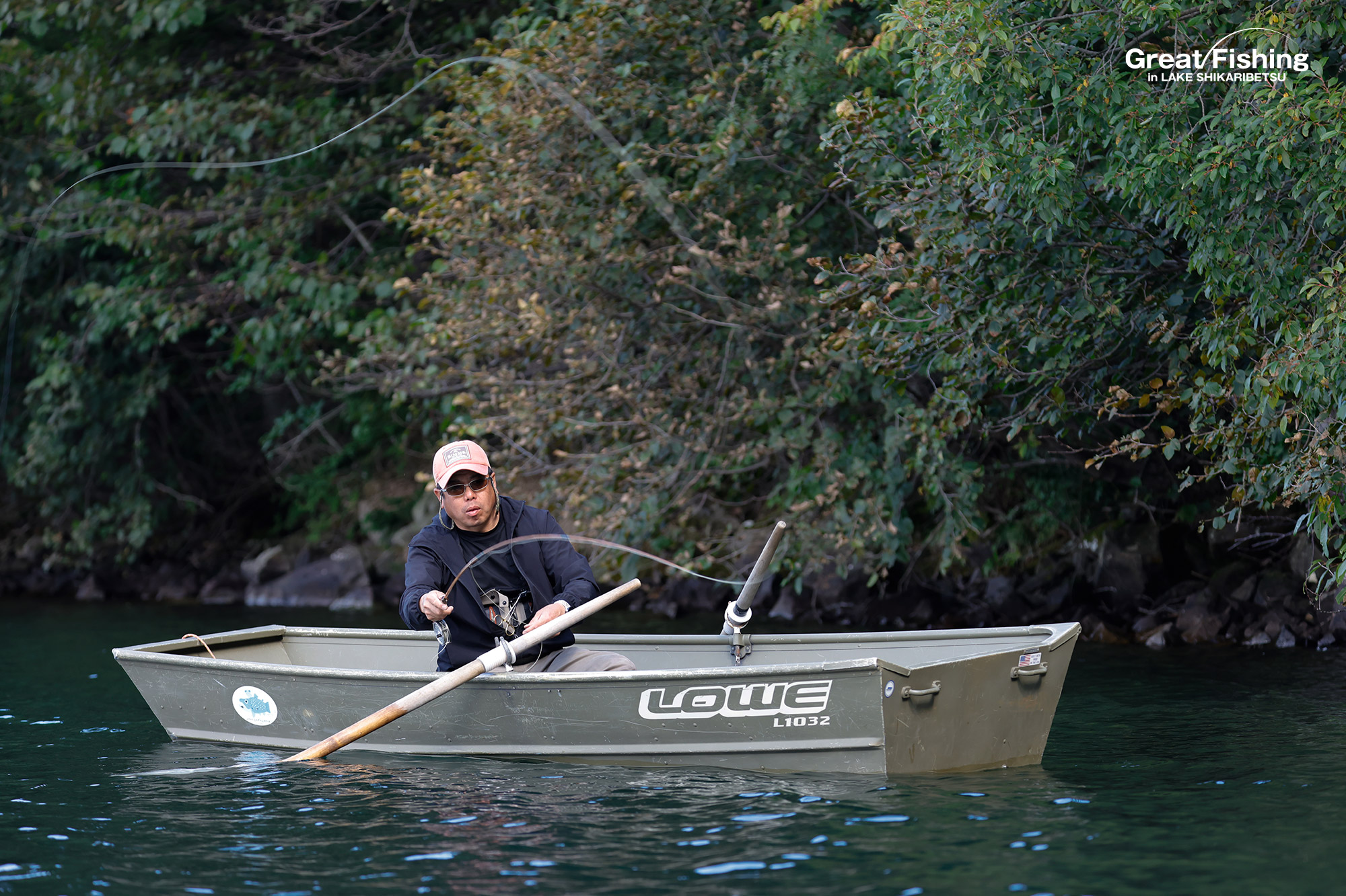 カルガモ岬⑤、シャクナゲワンド⑥、シャクナゲ岬⑦、音更湾インレット⑧の岸際をボートからのキャスティングでニジマス33cm、大型ニジマス(40〜45cm)3匹、音更湾⑩では岸からライズを狙い大型ニジマス(50cm)がドライフライ(#10ビートル)でヒット(南さん/千葉県)。同ポイントでドライフライ(ロイヤルコーチマン)で大型ニジマス(48cm)がヒット(土屋さん/札幌市)他。