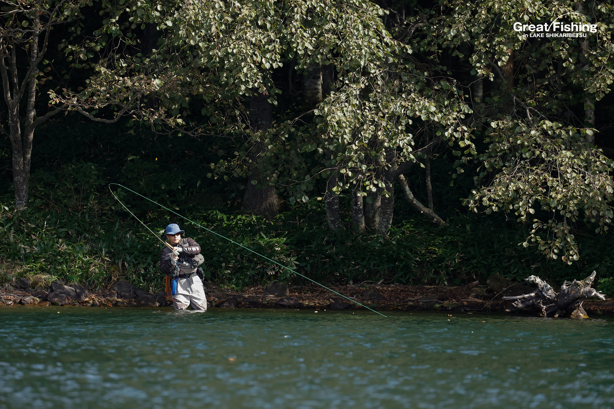 唐沢湾岸釣りエリアでは、ドライフライ(#8エルクヘヤーカディス)で大型ニジマス(46cm)がヒット(中山さん/東京都)。