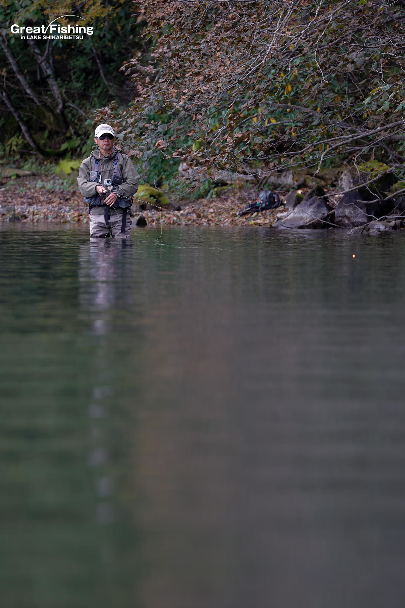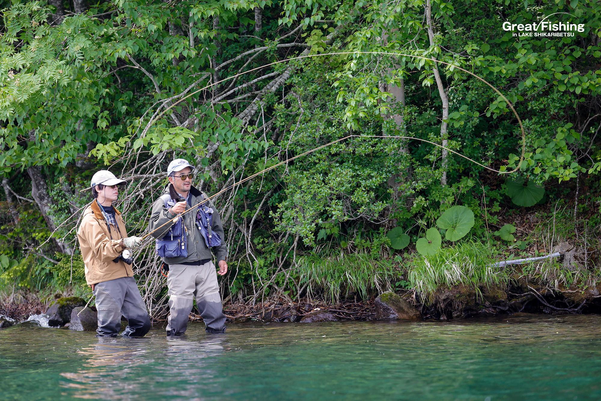 音更湾北側岸周辺⑫で大型ニジマス(49cm)がルースニング(#12ビーズヘッドへヤーズイヤー)でヒット(稲田さん/美唄市)。虹色岬③、カルガモ岬⑤ 、取水口周辺㉑ で大型ニジマス(40〜48cm)3匹が#10〜18パラシュート(黒)でヒット(澤崎さん/札幌市)。旧北電保養所前①、虹色岬③で大型ニジマス(40〜47cm)6匹ヒット(森本さんご夫妻/香川県)ほか。