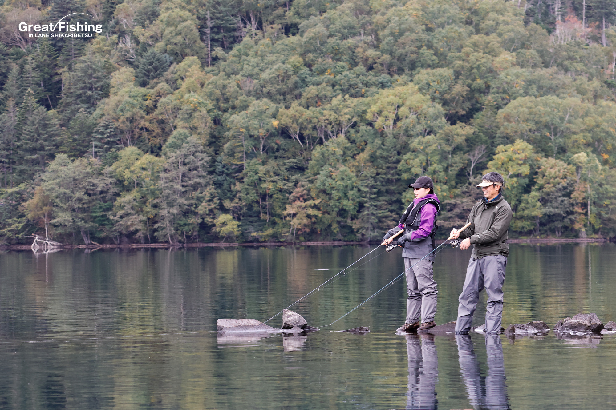 湖中央㉓、音更湾沖周辺㉔の水深(約10m)でミヤベイワナ(25cm、32cm)3匹がスプーン10gでヒット、バラシ3匹(太田さん/岩手県)。同ポイントの浅い水深(1〜2m)でミヤベイワナ(30cm、35cm)2匹がスプーン5gでヒット(奥本さん/斜里町)。アイサ岬⑭でミヤベイワナ(25cm、30cm)2匹がスプーン12g(グリーンアワビ)でヒット。1匹は秋色の婚姻色(石崎さん/帯広市)ほか。