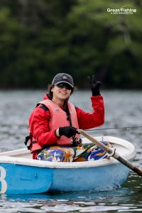 音更湾沖周辺㉔でスプーン8g(ピンク)を10~15秒沈めて水深3~5mをトローリングでミヤベイワナ(23~33㎝)7匹、ニジマス(30㎝、36㎝)2匹ヒット。湯の花岬周辺⑯㉒でミヤベイワナ(25㎝、31㎝)2匹、ニジマス(38㎝)1匹ヒット(福澤さん/神奈川県)。湯の花岬⑯、シャクナゲ岬周辺⑦⑥㉔でスプーン7.5g(ピンク)を表層トローリングでミヤベイワナ(28~30㎝)4匹ヒット。音更湾南側岸周辺⑨で(シンキングラインタイプ3+#8アオミドロ/オリーブ)を表層ハーリングでミヤベイワナ(27㎝)1匹、2の湾南側岸⑰でサクラマス(38㎝)1匹ヒット(海村さん/東京都)。