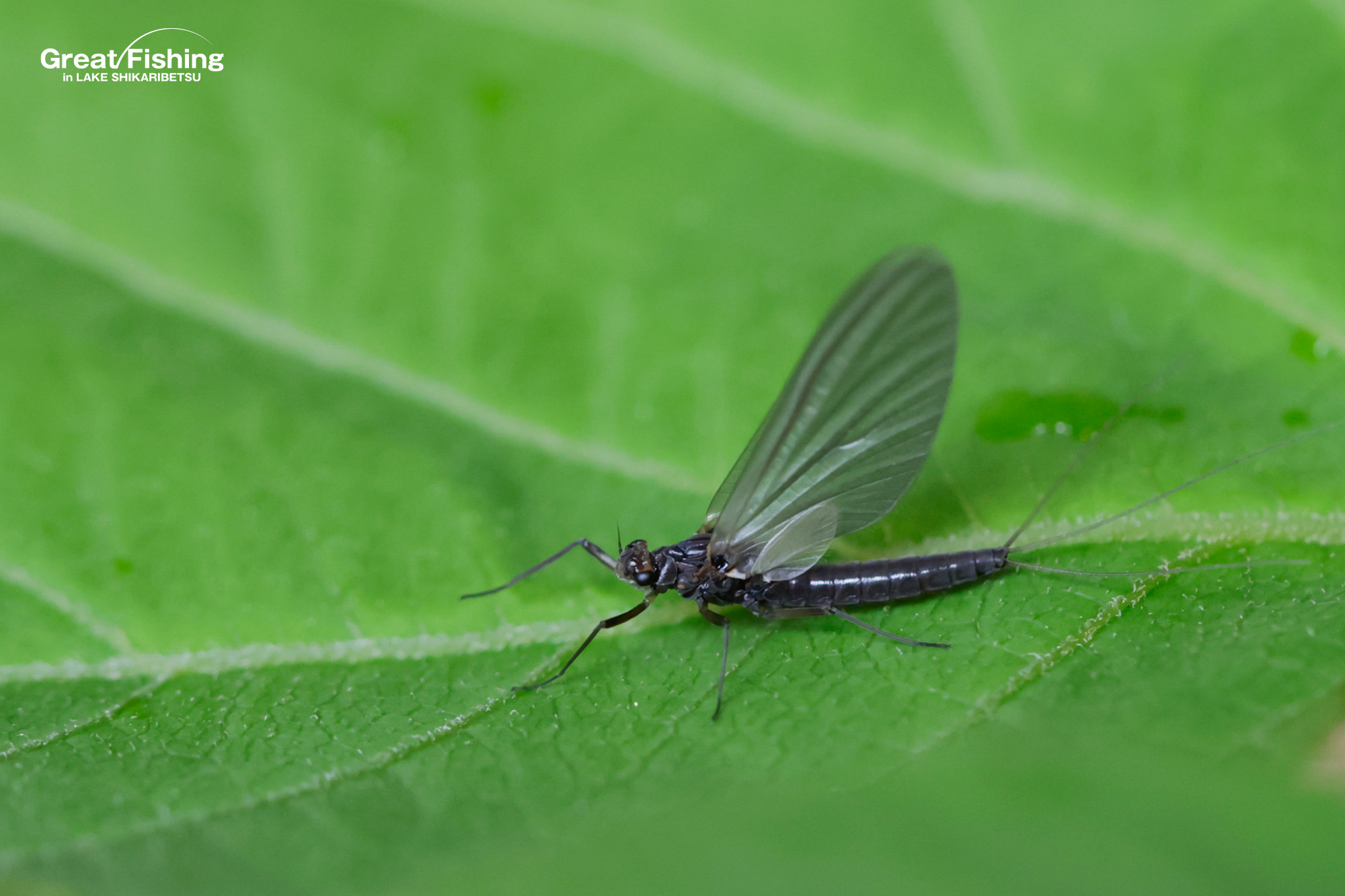 カゲロウ目 トビイロカゲロウ科 大きさ(10mm前後)時期( 6月初旬〜6月中旬)薄いグレーの翅を持った黒っぽい水生昆虫。体は細長く、尻尾は3本。
