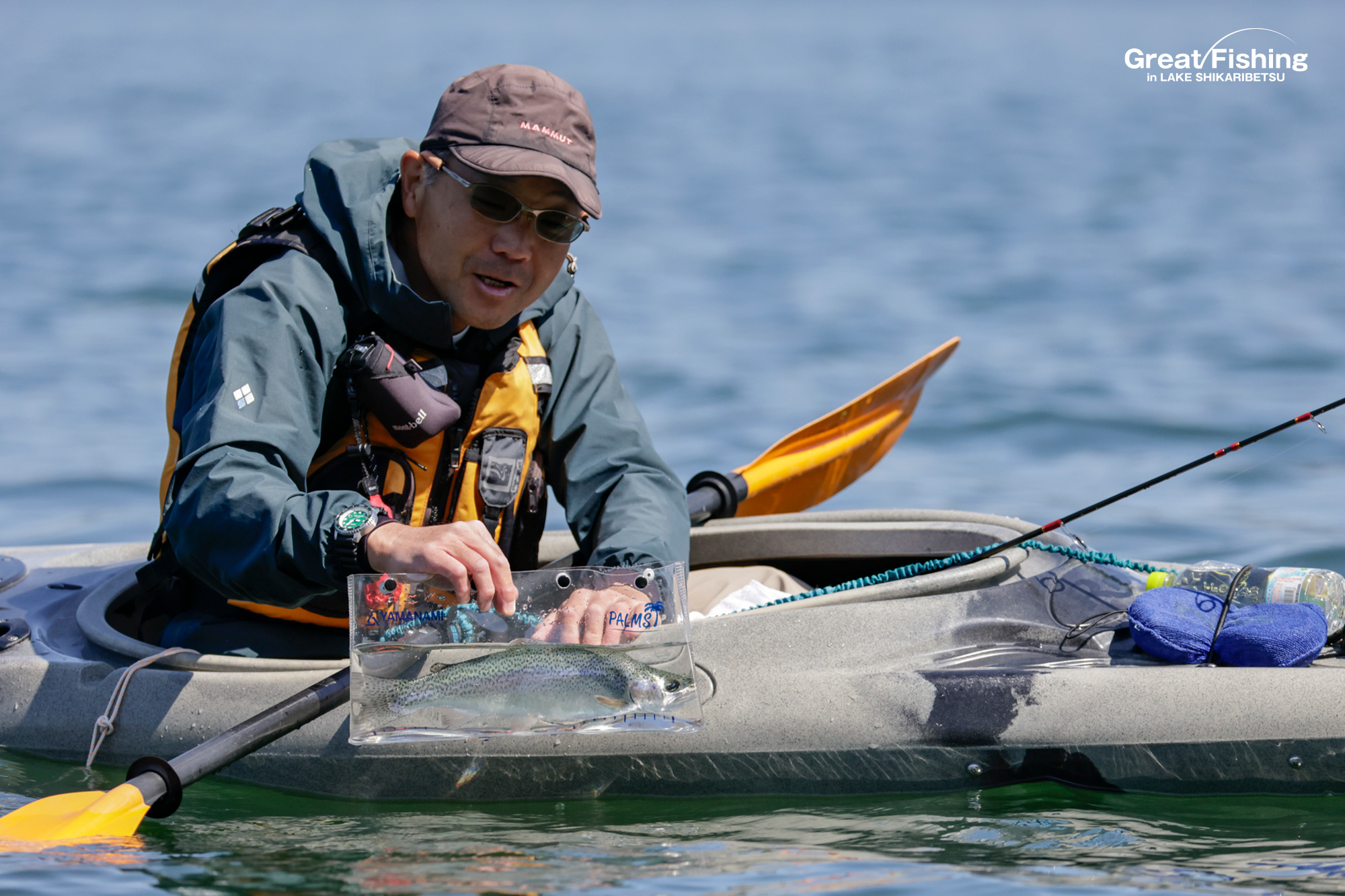 今日のビッグワン ニジマス50cm(増澤さん)然別湖ガイドマップ