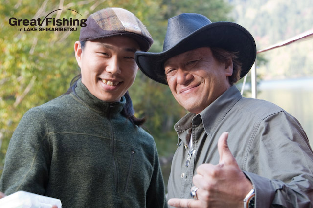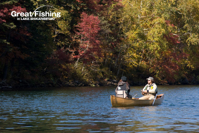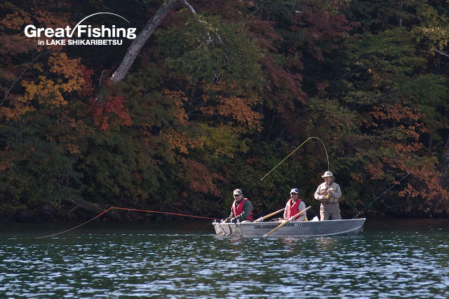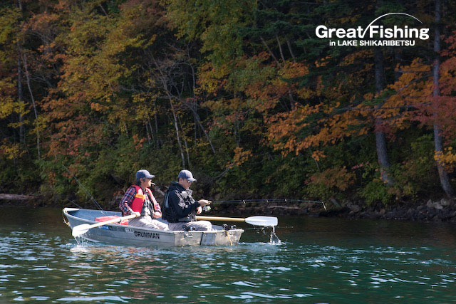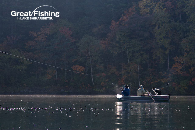 早朝は曇りと霧でしたが午後になるにつれて気持ちの良い秋晴れになりました。1の湾では最高のコンディションのニジマス(40〜55cm)、サクラマス(25〜40cm)が数多く釣れています。音更湾、うぐいす湾でもニジマス、サクラマスが好調。2の湾ではニジマス(30〜58cm)、サクラマス(25〜35cm)、ミヤベイワナ(25〜40cm)が釣れています。全体的にはサクラマスが一番多くヒットしており、続いてニジマスが釣れています。ミヤベイワナは食いが渋くヒットしてもバレが多く、またルアーを手元まで追うもののヒットには至らないケースが多いようです。