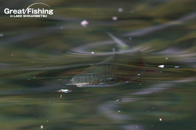 今日も1の湾(東側かけ上がり)で、ニジマス(30〜55cm)が好調。早朝、ルアー(スプーン7g、金/赤)に(55cm)がヒット。午後には、ライズも始まりドライフライ(#14パラシュート)や、ニンフ(#12ヘヤーズイヤー)に(40〜50cm)クラスがヒットしています。思い出岬では、ニジマス(55〜60cm)が表層をクルージング&ライズ。ボートの近くまで来ても目の前で夢中に陸生昆虫を補食しています。しかし、岬の風ウラは太陽光が降り注ぎベタ凪の為、ドライフライを完全に見切るようです。思い出岬ウラのニジマスを狙うには、午後2時以降の日が傾く時間帯が狙い目。50cmを超えるニジマスのライズは見応え十分、フライフィッシャーなら一度はドライフライでヒットさせてみたいものです。