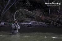 穏やかな水面には至る所で魚たちがライズ。終日ドライフライで数多くの魚がヒット。特に大型のニジマスは、陸生昆虫が溜まる岸際に集中し、ドライフライでヒットするもラインブレイクやバレが非常に多いようでした。フライロッドは(#5〜#8)、リーダー&ティペットは(3〜4X)が最適。