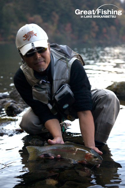 昨日同様、午前11時30分頃から思い出岬(ホテル側)で、複数の大型ニジマスがクルージング&ライズ。数名のフライフィッシャーが挑むも、なかなかフライを食わず大苦戦。午後になり、#16ビートルで50cmクラスをヒットさせるも(6Xのティペット)でラインブレイク。湯の花岬(3の湾側)でも、同じように複数のニジマスがライズ。数時間粘って#16ソフトハックルで(43cm)ようやくヒット(南さん/千葉県)。目の前で悠然とライズを繰り返す大型ニジマスはかなり手強いようです。