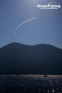 アイサ岬[ポイントNO13]〜湯の花岬[ポイントNO14]の沖合を、超スロースピードでボートを漕ぎ、ミヤベイワナのレンジを探ります。魚のアタリが多いポイントを何度も繰り返しトローリング。(今日の釣果は2人で合計29匹)。