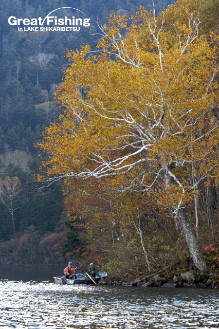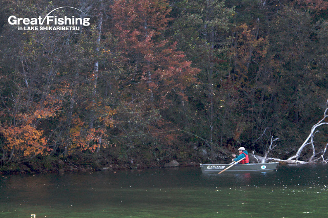 穏やかな秋晴れに恵まれた然別湖。午前11時ころから気温も上昇し、各ポイントでは大型ニジマスのライズが一斉に始まりました。ニジマスは、木の下や、風ウラに溜まった多くのアワフキムシ(アワムシ)や、カメムシ、テントウムシなどを捕食しています。しかし、秋のニジマスは、かなり手強いので、[フライパターン]、[キャスティング]、[タイミング]のすべてが揃わないとヒットさせることは難しいようです。今日のヒットフライは、#14〜#16カメムシ、#14〜#16ロイヤルコーチマンパラシュート、#14ヘヤーズイヤーニンフなど。