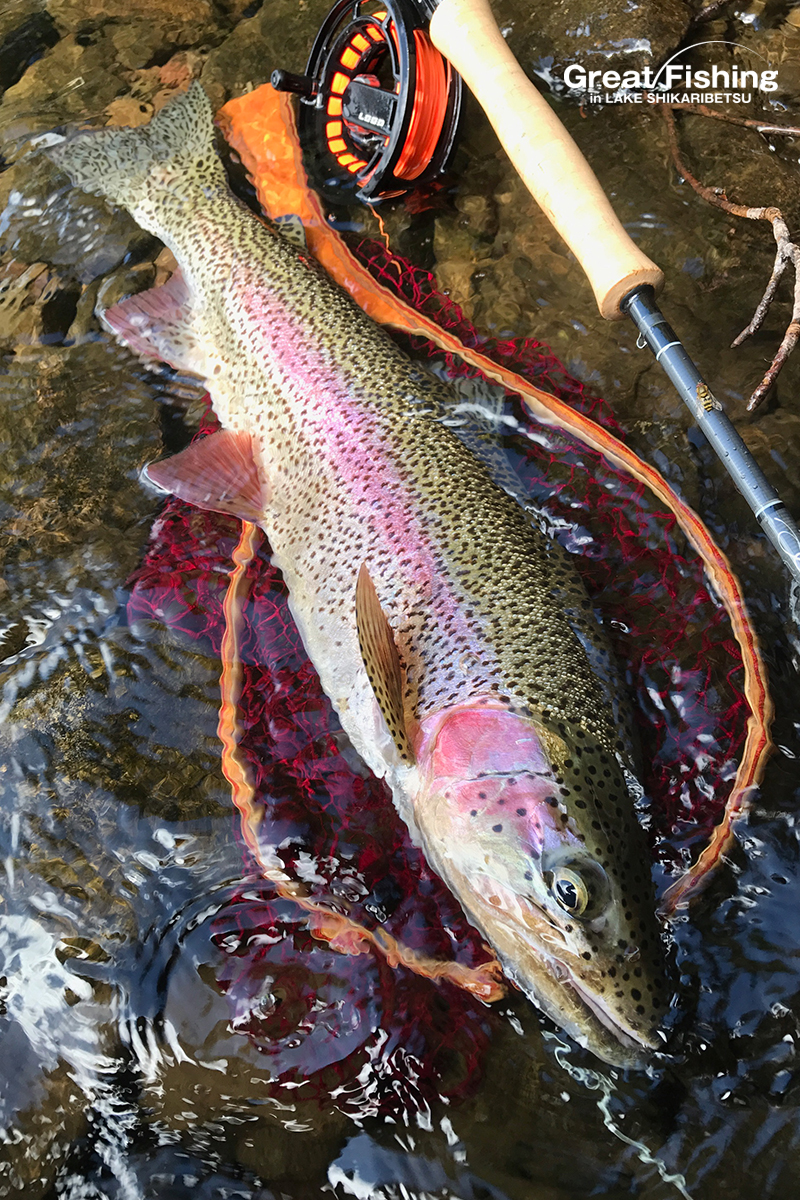唐沢湾岸釣りエリアでは、ビーズヘッドストリーマーで大型ニジマス(40cm)、(58cm)がヒット(根上さん/厚岸町)。
