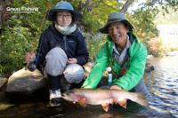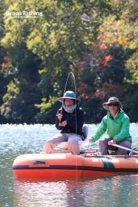 唐沢湾岸釣り専用エリアでは、#14ゴールドビーズヘッドニンフで大型ニジマス(50cm)がヒット(小糸Hさん/東京都)。同ポイントで、#14ゴールドビーズヘッドニンフで大型ニジマス(40〜48cm)3匹ヒット(小糸Tさん東京都)。