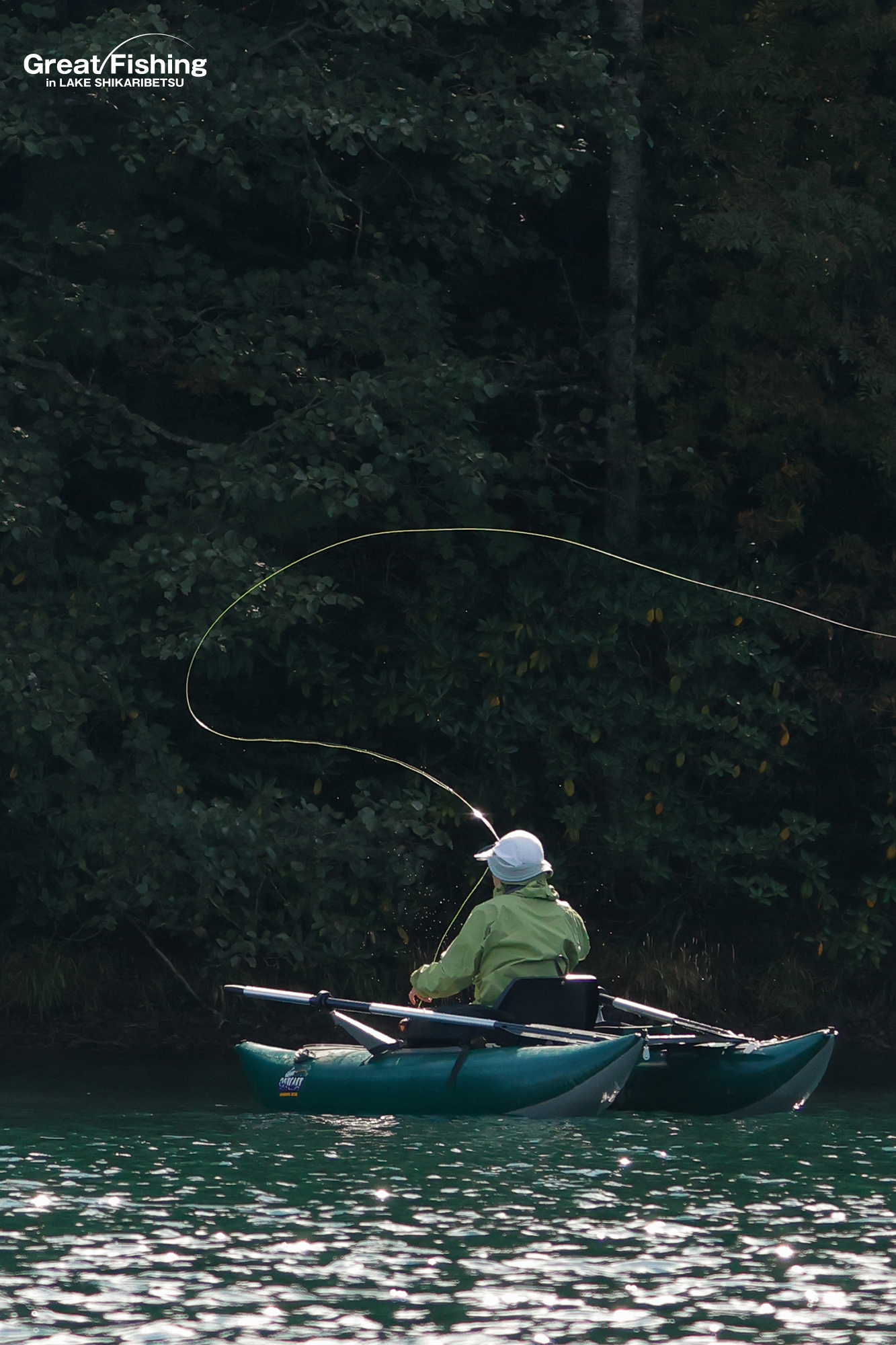 午前10時30分頃から砂場ワンド②の間でニジマスのライズがあり、ドライフライ(#16パラシュート/黒)で大型ニジマス(42cm〜49cm)3匹ヒット(中澤さん/東京都)。1の湾旧北電保養所前①周辺ではドライフライ(#8パラシュート/黒)で大型ニジマス(45cm)がヒット(澤崎さん/札幌市)。ニジマスワンド⑲周辺では(フローティングライン+#10ゴールドビーズヘッドニンフ)を岸から5mくらい離れて、カヤックでゆっくりハーリングして、大型ニジマス(40cm〜45cm)4匹ヒット(金澤さん/帯広市)他。