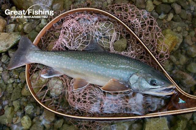 解禁初日から今日まで40cmアップのミヤベイワナが1日4〜6匹ほど釣れています。6日間でもっとも大きなものは45cm。アベレージサイズは30cm〜35cm。35cm〜39cmのミヤベイワナも数多く釣れいています。個体色はブラウンバック、グリーンバックの両方です。サクラマスやニジマスに比べあまり強い引きをしないミヤベイワナですが、40cmを超えるものはリールドラグの音が鳴るほど良いファイトをするようです。