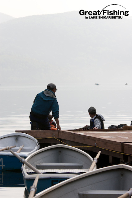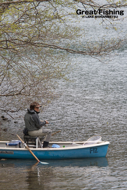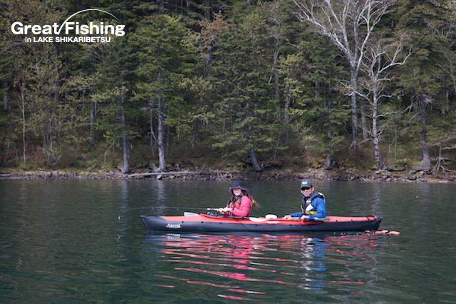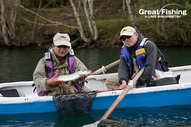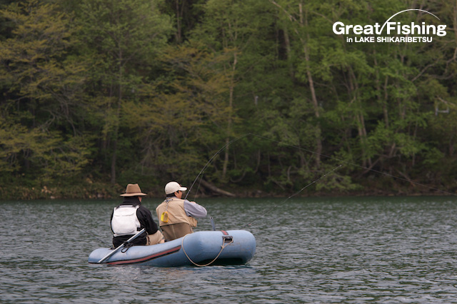 ミヤベイワナ(20〜40cm)は水温(13℃)の上昇に伴ない、水深(3〜5m以下)の深場に移動。連日のプレッシャーの影響か、アタリも弱く、食い渋り。早朝は水深約3mでもヒットしていますが、午後になると深場(5m以下)からのヒットが多いようです。サクラマス(20〜42cm)は好調でポイントによっては連続ヒットしています。全体の平均釣果は5〜8匹、今日の最高釣果は、15匹(木元さん/札幌市)。