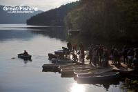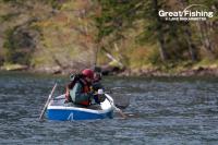 ファーストステージ初日は晴れ間が広がり、程よい風が吹く絶好の釣日和。早朝は掛け上がり2〜3mの表層でミヤベイワナ(25〜40cm)、サクラマス(25〜40cm)が良く釣れていましたが、時間が経過すると共に、ポイントによっては魚たちは掛け上がりの中層〜ボトム付近まで下がった様子。しかし、解禁初日ということもありフライ、ルアーともにレンジさえ合えば数多くヒットしたようです。