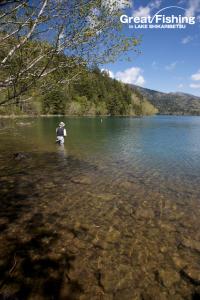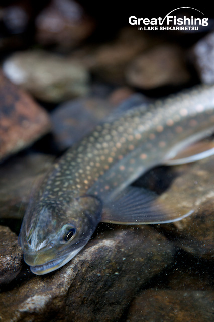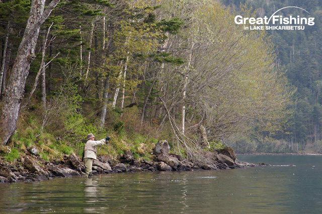 晴れた日は、陽の光で湖面が明るくなると一旦は5m以下に潜るようですが。メイフライのハッチや、極小さな陸生昆虫の湖面への落下、ワカサギなど小魚の活性が上がると同時に岸寄りして来るようです。今日も午後から、#18トビイロカゲロウがハッチし始めると、#18〜#16程度のドライフライでミヤベイワナ、サクラマスがヒット。またストリーマーをリトリーブしても、岸から1〜3m以内で釣れています。フライ、ルアー共に、ピックアップの瞬間まで丁寧にリトリーブすることでより多くのヒットが望めるようです。