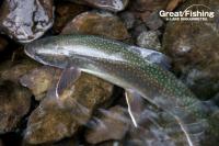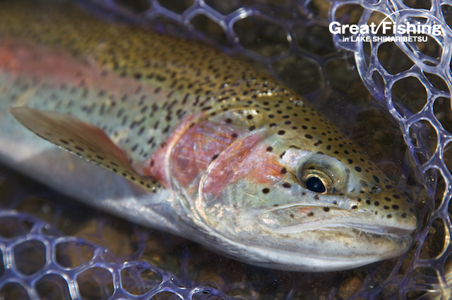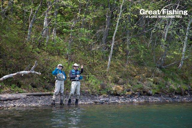 昨日良く釣れていいたサクラマス(25〜40cm)の釣果は減少したものの、ニジマス(25〜55cm)のヒットが増えてきたようです。解禁初旬のニジマスのコンディションは産卵後のためやや細身ですが、50cmを超えるものは良いファイトをしてくれます。ルアーのラインは8ポンド〜10ポンド。フライのリーダー&ティペットは1〜2Xを使用しないとラインブレイクすることもあり。ニジマスはこれから徐々にコンディションを回復させ、6月末〜7月にはさらに力強いファイトが楽しめます。