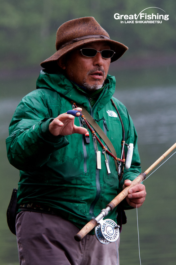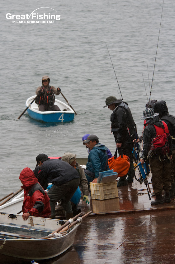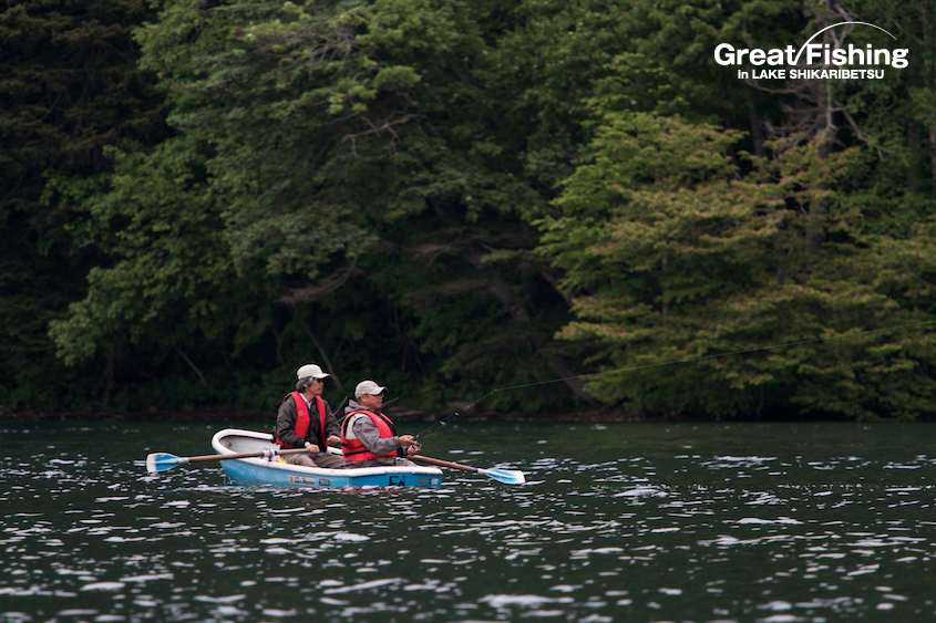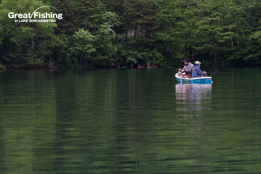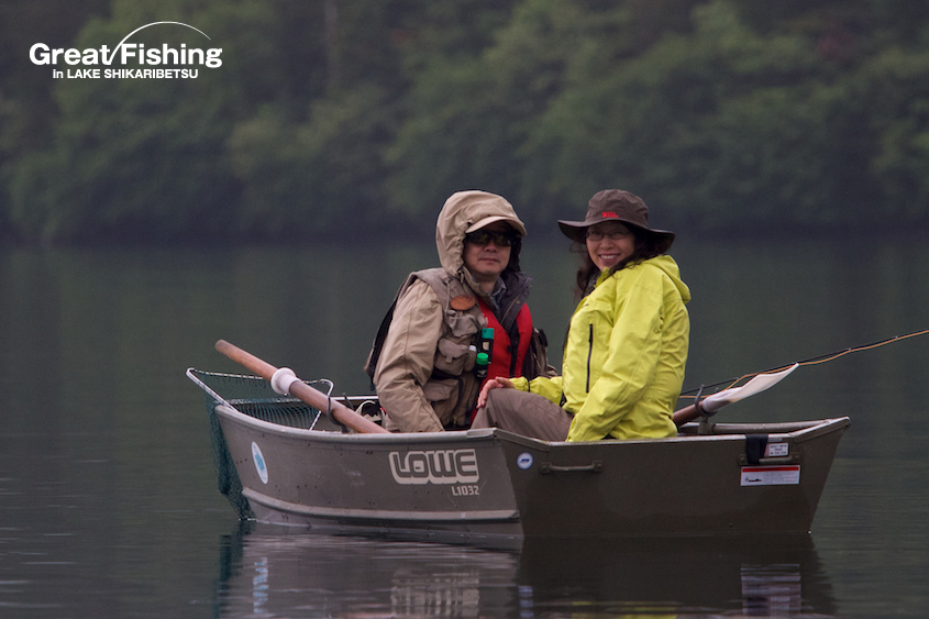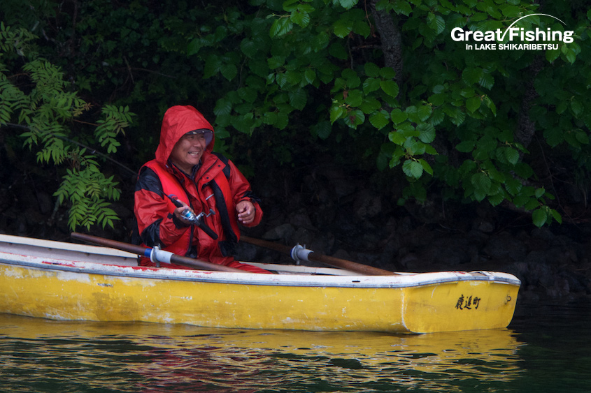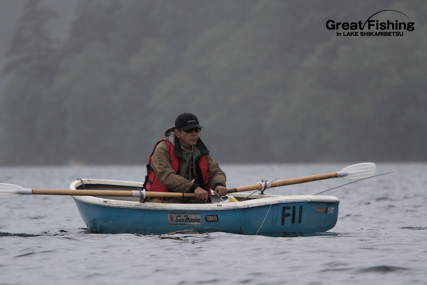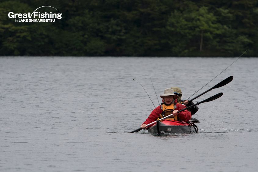今日で4日連続の雨・・・その影響で表面の水温は上がることなく(14.5〜14.7℃)で安定しています。全体的に釣果は良く恵みの雨になっているようです。早朝は水深(1〜3m)でミヤベイワナが良くヒットしていましたが次第にレンジを下げ、午後になると水深(3〜5m)のヒットが多いようでした。今日の最高釣果は60匹(大平さん/茨城県)。