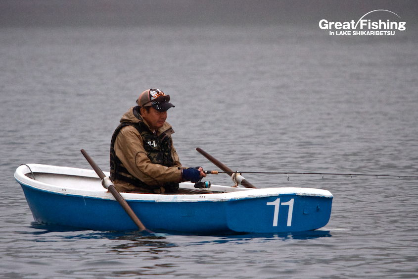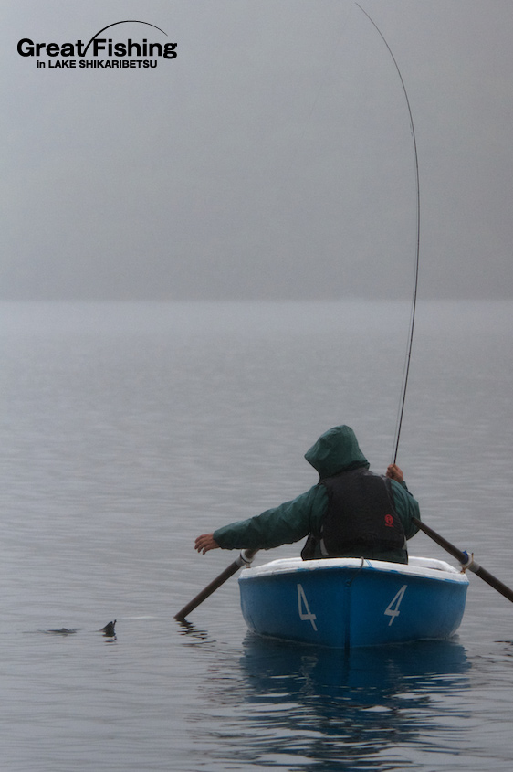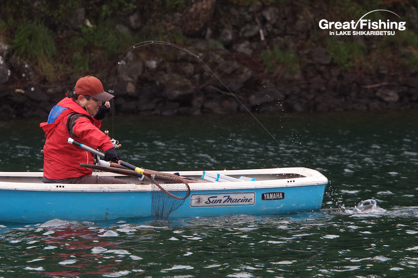 ハーリングの場合、ボートは歩く早さのスピードで移動し、小さなアタリでは合わせを入れず、そのままボートを移動または小刻みにリトリーブ。しばらくして大きなアタリを感じたら、ロッドを立てるように合わせるとフッキング率が上がるようです。今日は全体的に好調で、1人/14〜30匹のミヤベイワナをヒットさせています。今日の最高釣果44匹(廣田さん/東京都)。
