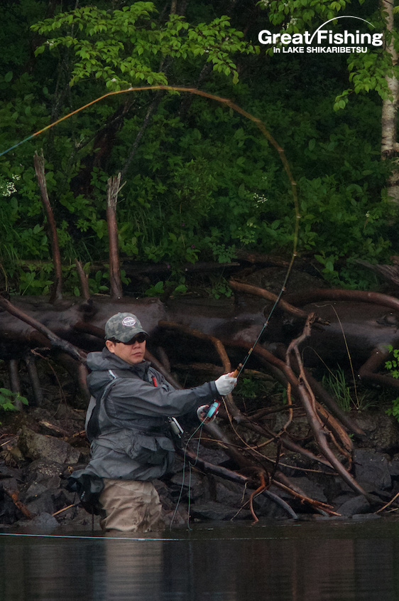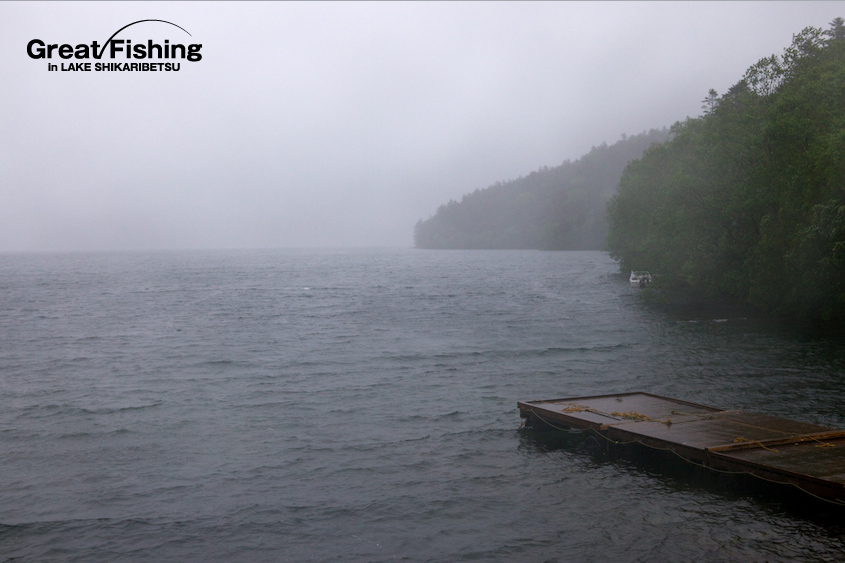 早朝から雨と風の厳しい天候・・・5月下旬から6月初旬にかけて約1週間程度続いた高気温(25〜30℃)の影響で、表層の水温が例年に比べ4〜5℃と高く15℃。しかし水深(3〜5m)の水温は11℃以下でイワナの適水温になっています。ミヤベイワナのヒットが一番多いのも水深(3〜8m)の範囲。岸からのキャスティングでは、ボトムまでルアーを沈めてからリトリーブして、中層あたりでヒットが多いようです。また岸近くのヒットはサクラマス(25〜40cm)、岸から離れた場所ではミヤベイワナ(25〜40cm)が釣れています。