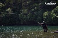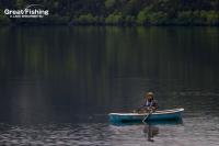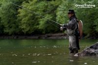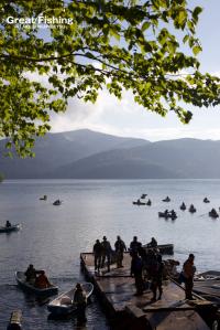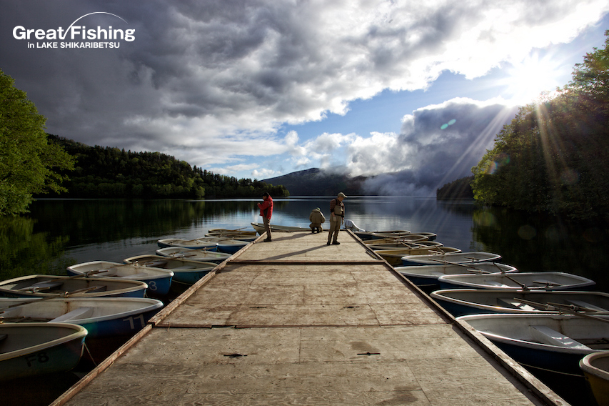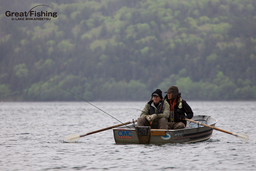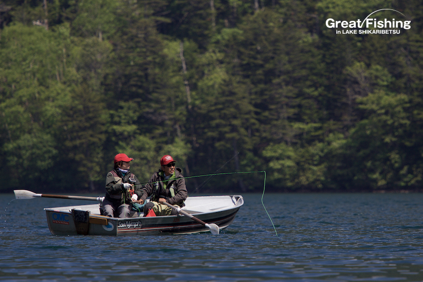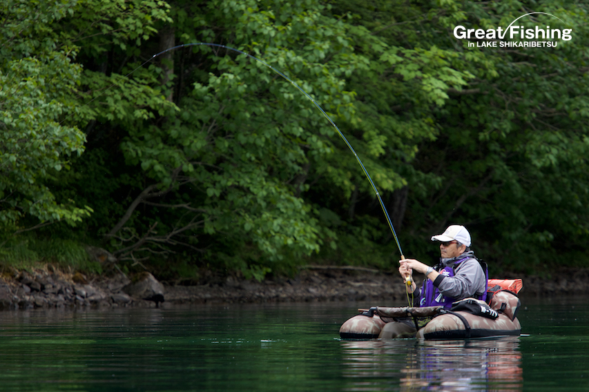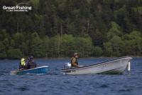 昨夜の大雨が朝方には止み午前6時にファーストステージが開幕。早朝から水深(1〜3m)でミヤベイワナ(25〜45cm)、サクラマス(25〜49cm)が絶好調。ルアー、フライともに非常に良く釣れています。釣果は平均20〜30匹。40匹台が8名、50匹〜60匹が8名、70匹〜90匹が2名、今日の最高釣果は103匹(中村さん/東京都)