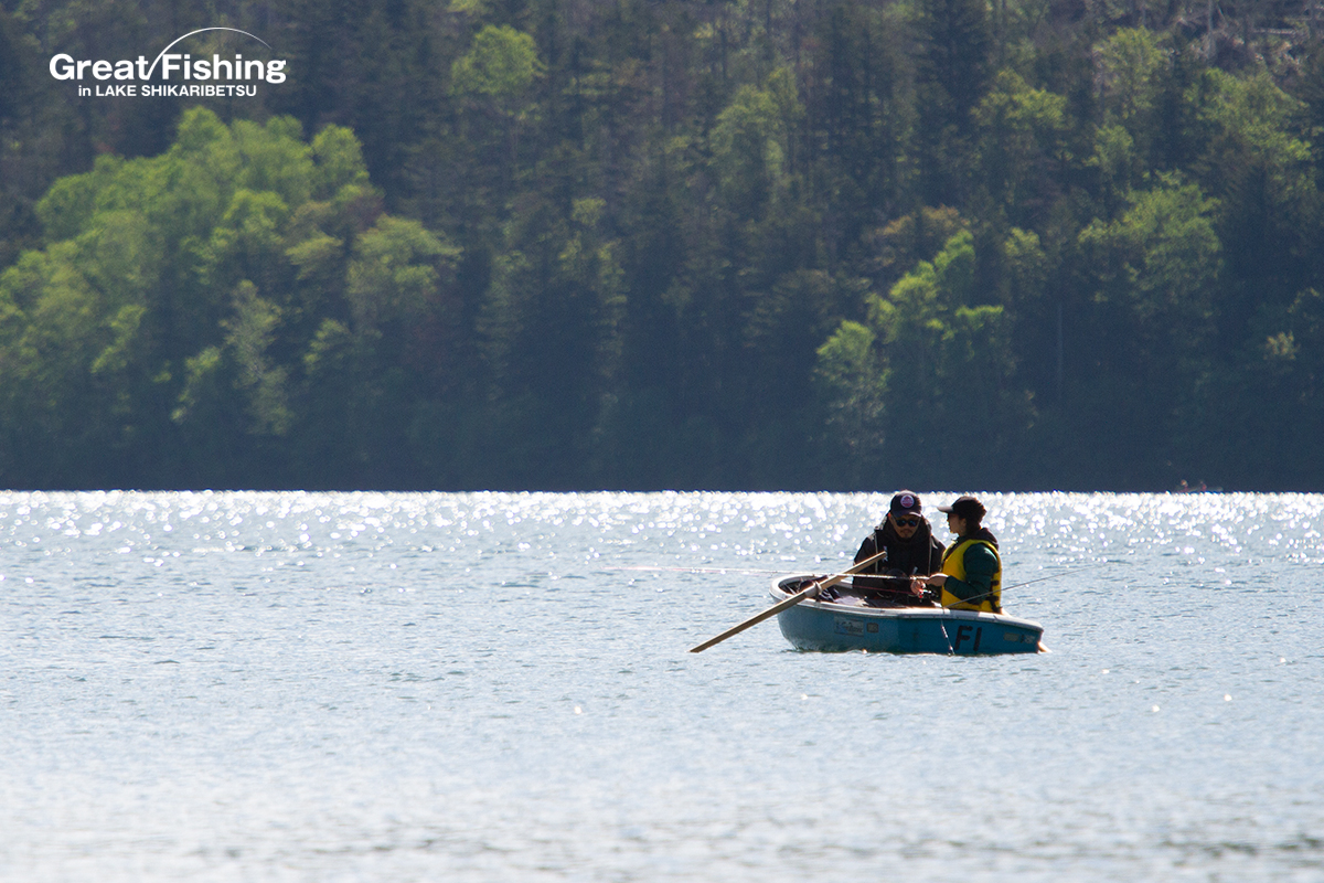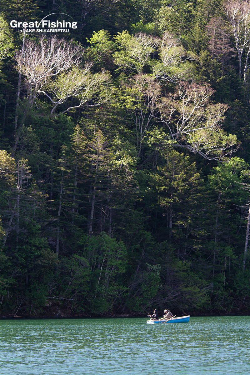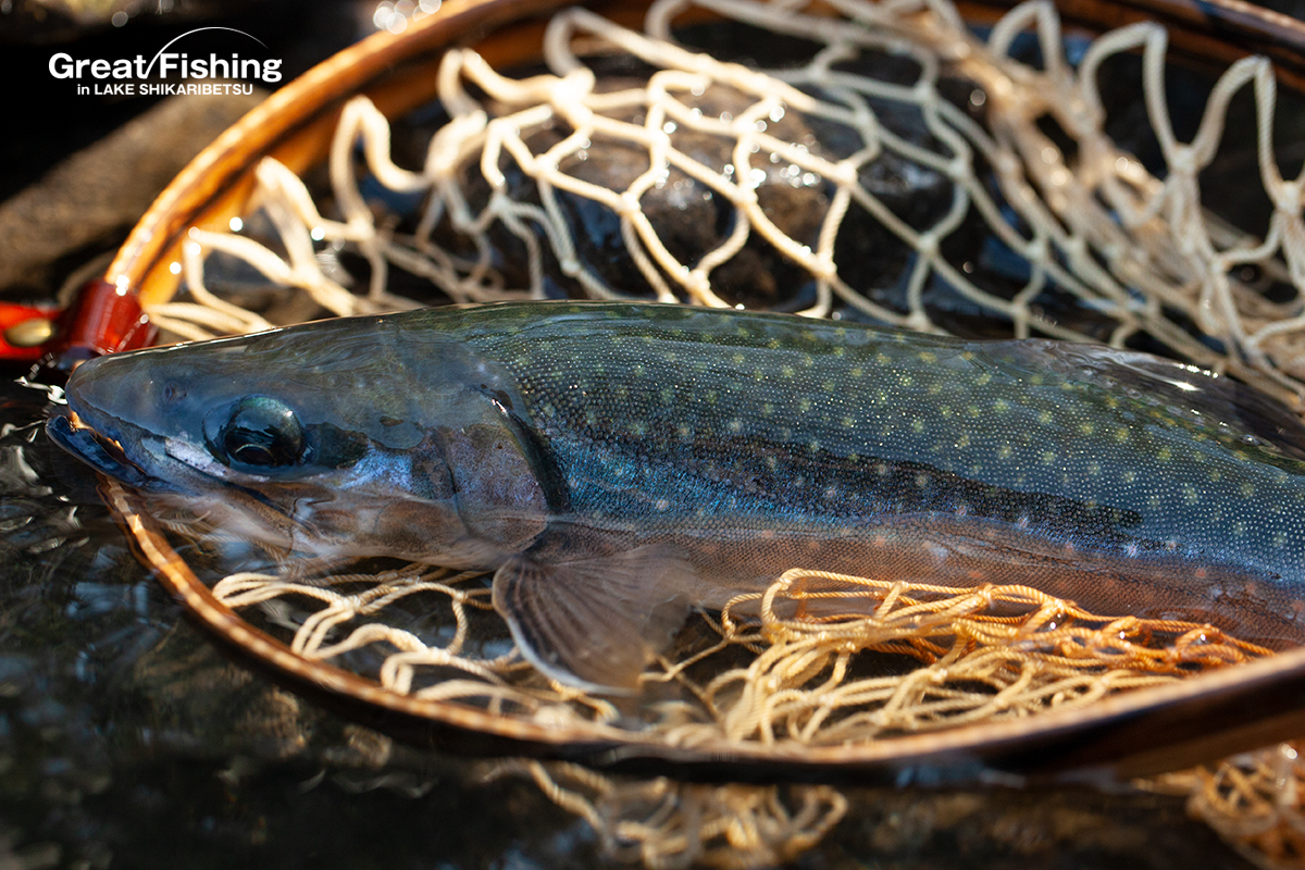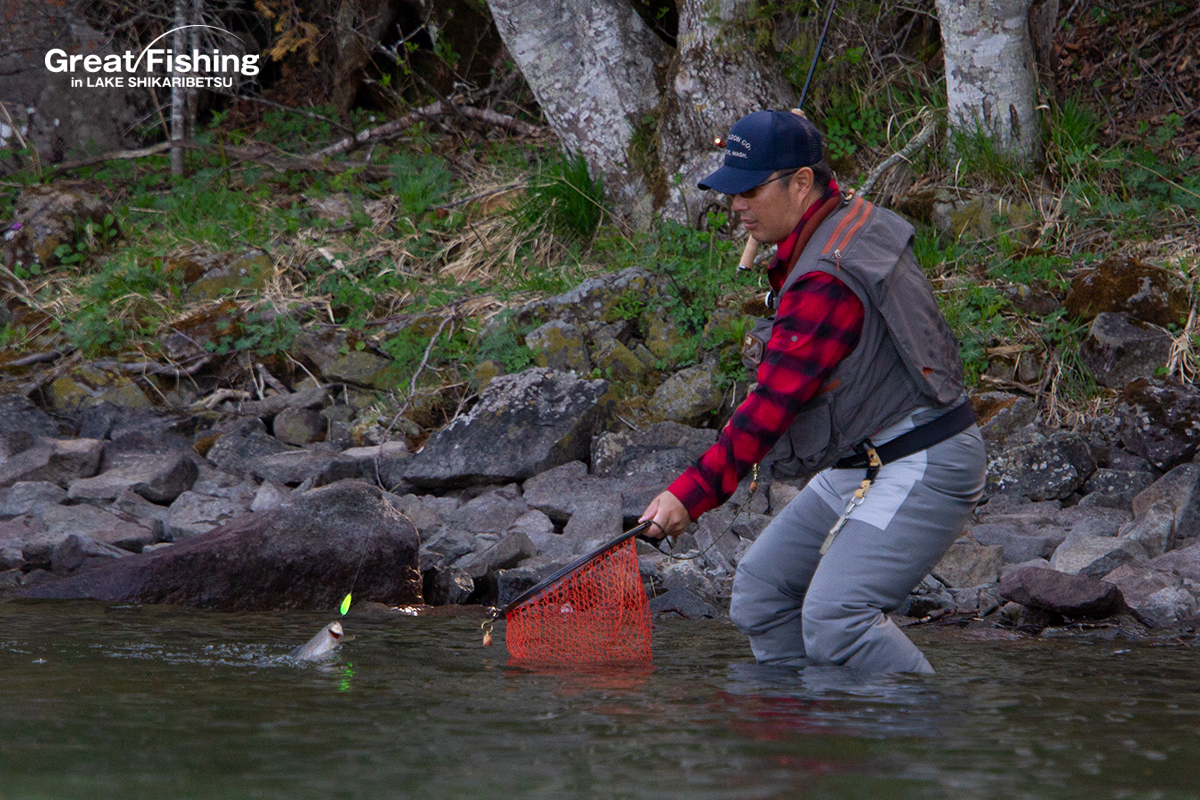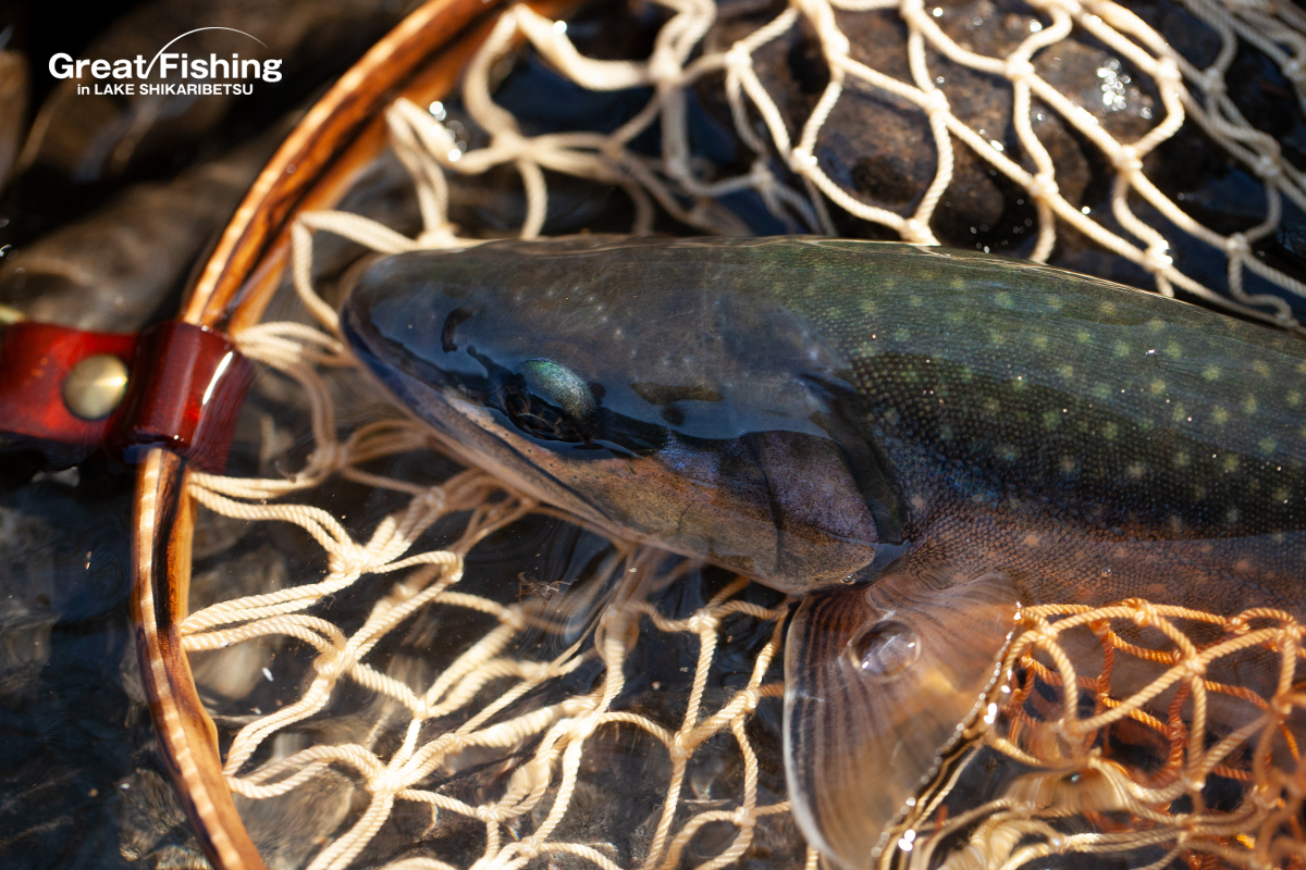 岸近くのかけ上がりで釣れていたミヤベイワナのヒットは減少しています。アタリも小さくショートバイトでフッキングしてからのバレが非常に多いようです。ミヤベイワナの場合は、ヒットしてからテンションを緩めない程度にゆっくりリトリーブしてから水中でネットインさせるとバレが軽減できます。