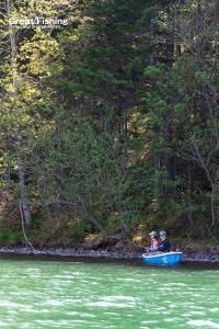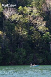 ミヤベイワナは連日好調。早朝は浅い水深(3m)でもヒットしますが、太陽が昇ると魚は深場へ移動するので、さらに深い水深(5m以上)を探るといいようです。カルガモ岬⑤ではミヤベイワナ、サクラマス、ニジマス合わせて45匹ヒット(牛山さん/群馬県)ヒットルアーは(スプーン11.5g)カラーは(金赤や金緑)など。