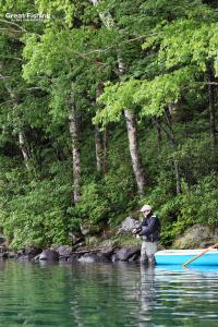 ㉕境界線中央周辺、㉓湖中央周辺でミヤベイワナが釣れています。(PE0.6号+リーダーナイロン12LB)スプーン12g(赤/金)を水深15m程度沈ませてからトリーリングまたはリトリーブでミヤベイワナ(25〜40cm)22匹ヒット(藤原さん/広島県)。同ポイントと⑭アイサ岬周辺では、ミヤベイワナ(25〜35cm)5匹、ニジマス(45cm)1匹ほか(染谷さん/札幌市)