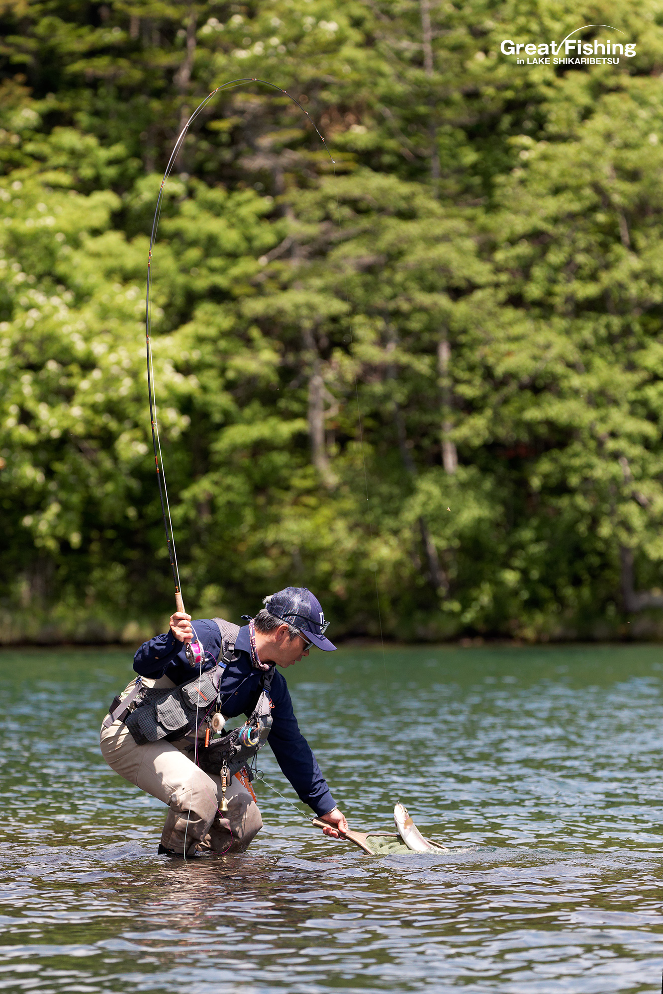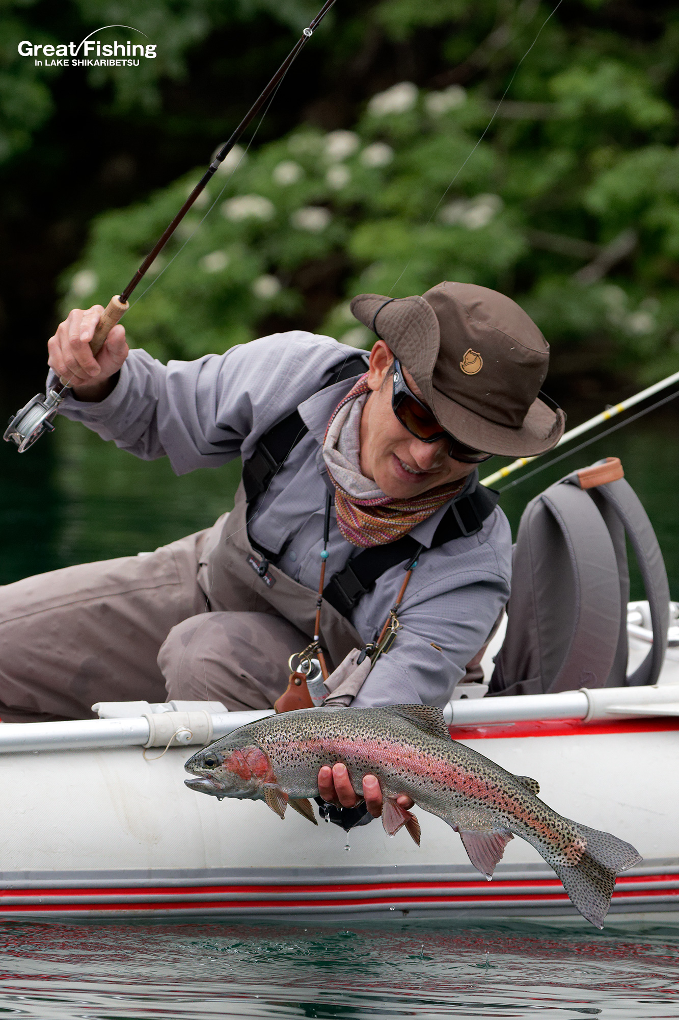 唐沢湾岸釣りエリアでは、ニジマス(30〜49cm)10匹がルースニング(ビーズヘッドニンフ/黒)でヒット(斎藤さん/帯広市)、大型ニジマス(45〜50cm)2匹ヒット(遠藤さん/札幌市)他。
