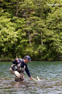 岸際ではストリーマー、ニンフで、大型ニジマス(40〜45cm)2匹ヒット(金森さん/神戸市)、スプーンでは岸から3〜5m離れたブレイクのボトムまで一旦沈めてからリトリーブして(42〜48cm)5匹ヒット(野村さん/神奈川県)他。